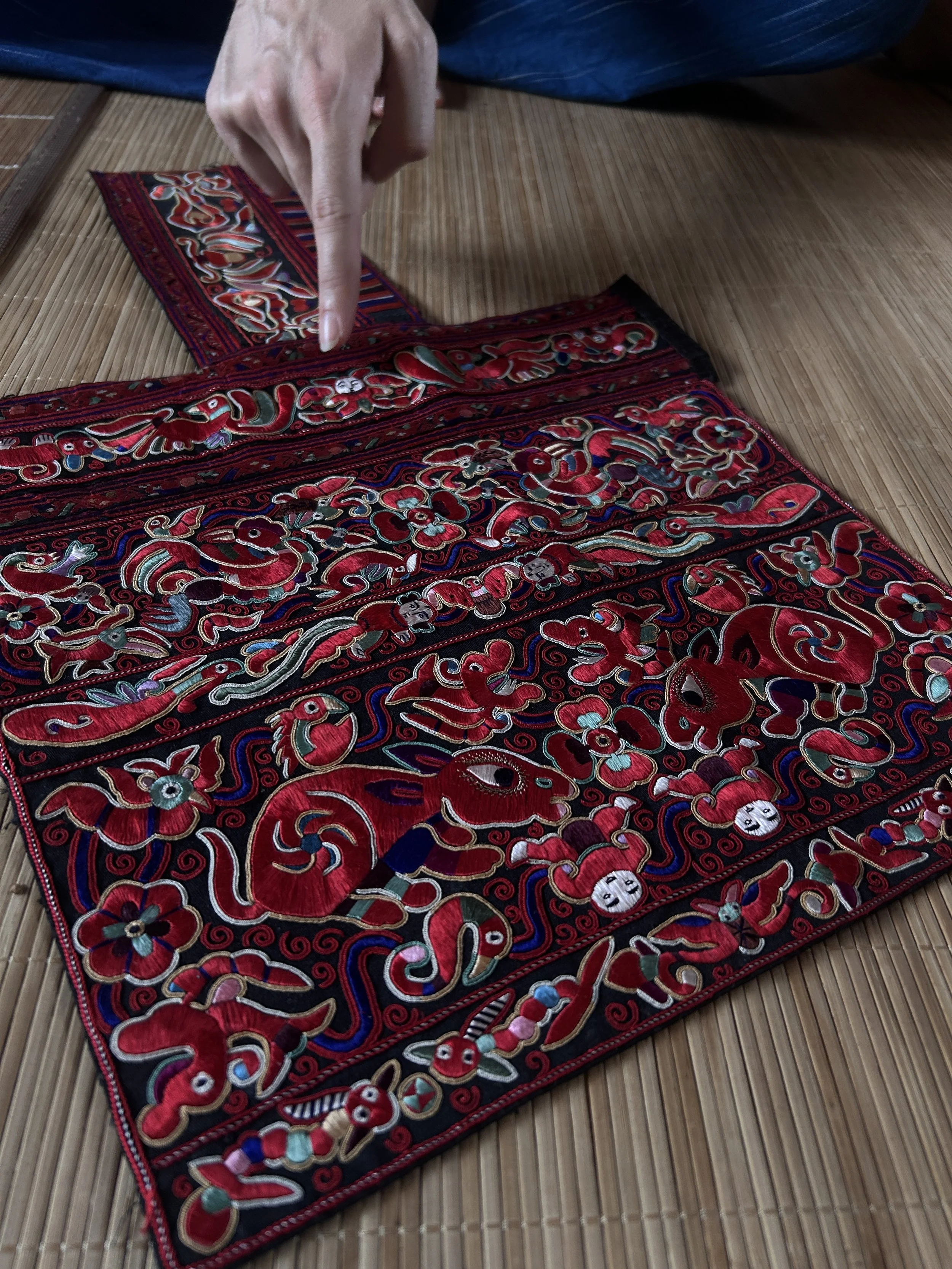 During our stay, Pan Xiaomei, a master embroiderer from the indigenous Miao community, brought her personal textile collection to the workshop, revealing cloth that spoke in sigils, stories, and ancestral metaphor. Because the Miao people do not have a written language, history and legend are carried through symbols stitched directly into fabric. With her, we learned about the mythic lexicon of both Dong and Miao textiles, decoding patterns as more than decoration, but as real language.