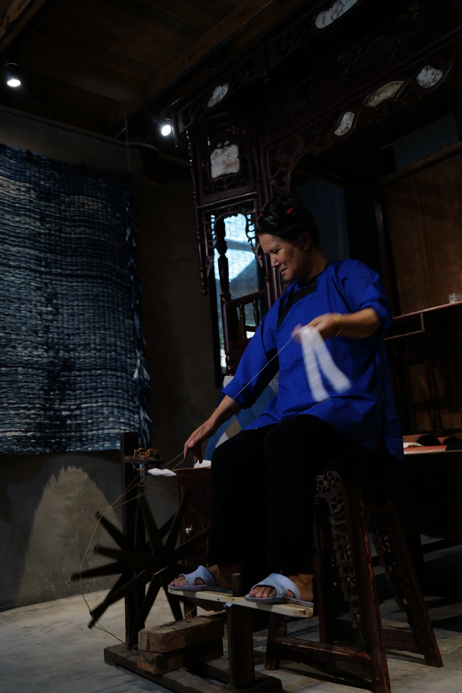 From Yangshuo, we traveled to Qiandongnan in Guizhou Province, a mountainous region and the homeland of the Dong people. We were warmly welcomed with traditional song and ceremony. We stayed in a traditional Dong wooden house, built by hand, without nails, and engineered by a lineage of craft and ecological intelligence. This was also the home of Yang Yi and the Deyi Living workshop, where many of their textiles are made. There, we learned loom weaving, cotton hand spinning, and natural dye processes using fermented Chinese yam, indigo, and mugwort, and learned about their ancient processes they use to create their special textiles. We were able to handle heirloom textiles still used in Dong ceremony and ritual today.